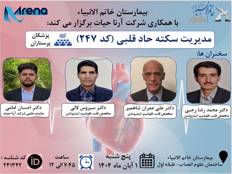 بیمارستان خاتم الانبیاء (ص) با همکاری شرکت آرنا حیات برگزار می کند: مدیریت سکته حاد قلبی (کد 247)